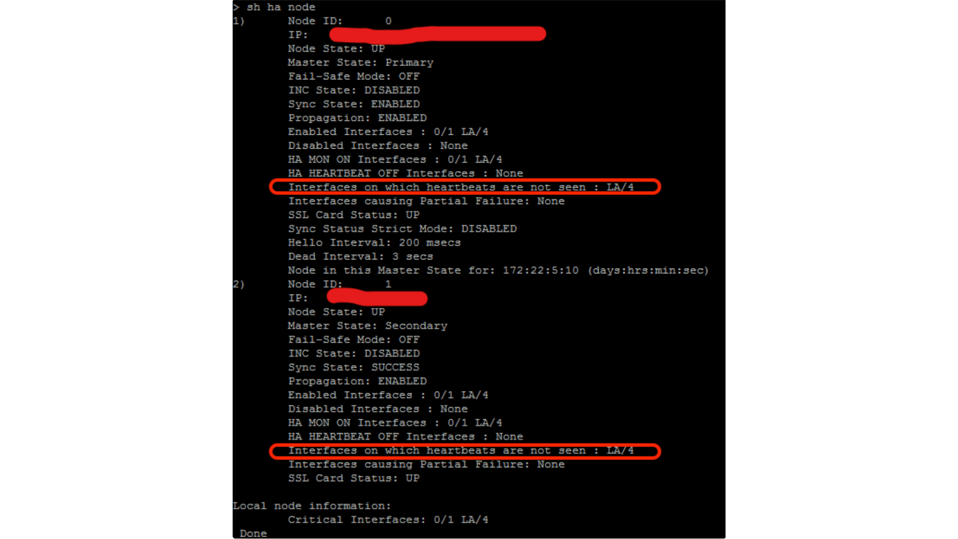 Run show ha node to see which interfaces are sending and receiving heartbeats. If heartbeats are missing, you’ll see output like:
