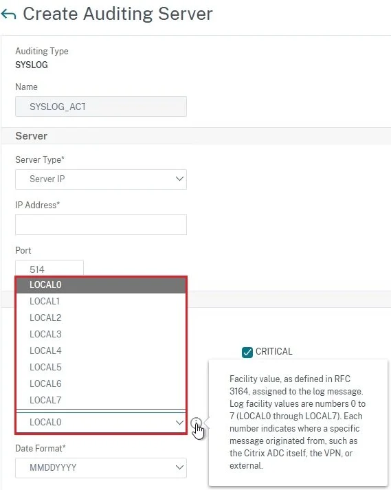 Let’s take a closer look at the syslog configuration. When creating an auditing server, you must choose your log facility value. This will define which log file events the auditing server will receive by the NetScaler ADC. All the values are pre-defined, and you will have to decide which one to use depending on your needs.