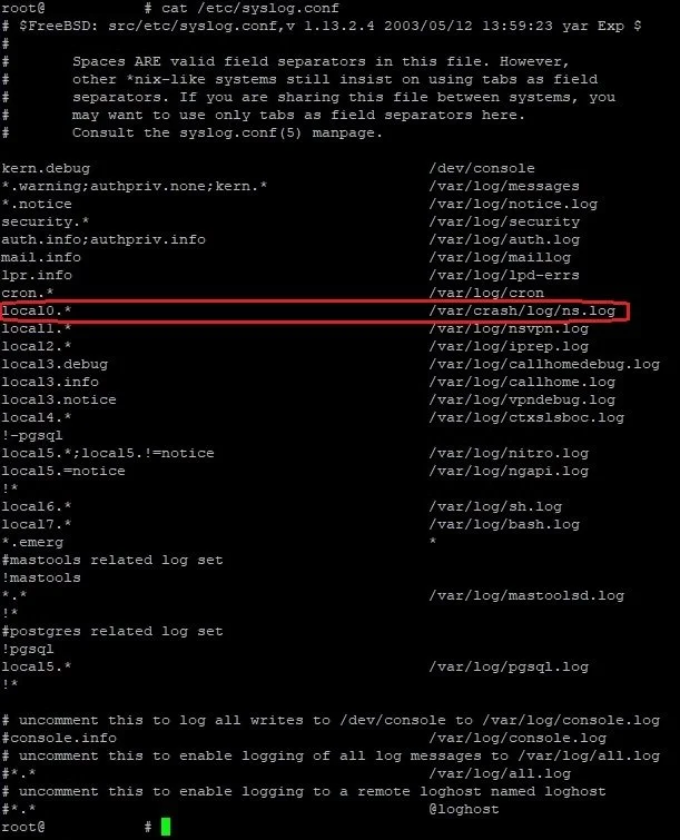 In our case we would like to move the ns.log file location. Therefore, we need to adjust the “local0.*” location. After the modification, we are aiming for the log file to reside on the second partition which means that it should be pointing to /var/crash/ folder. We decided to move the “local0.*” location to “/var/crash/log/ns.log”. After modifying the file, it should look like this: