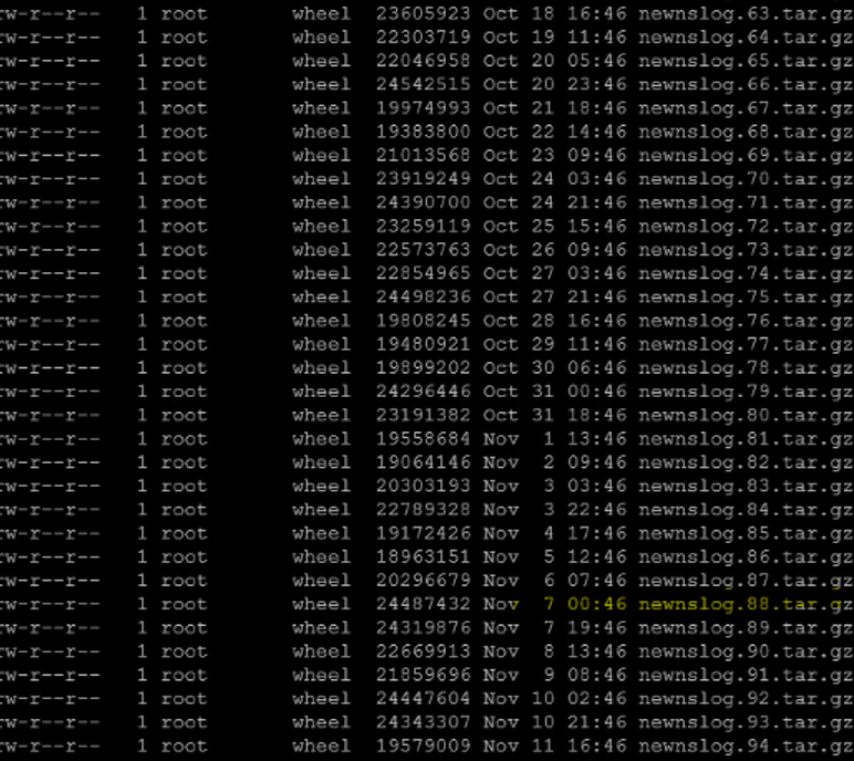 Identify the newnslog archive that matches the day and time you want to investigate, for example: