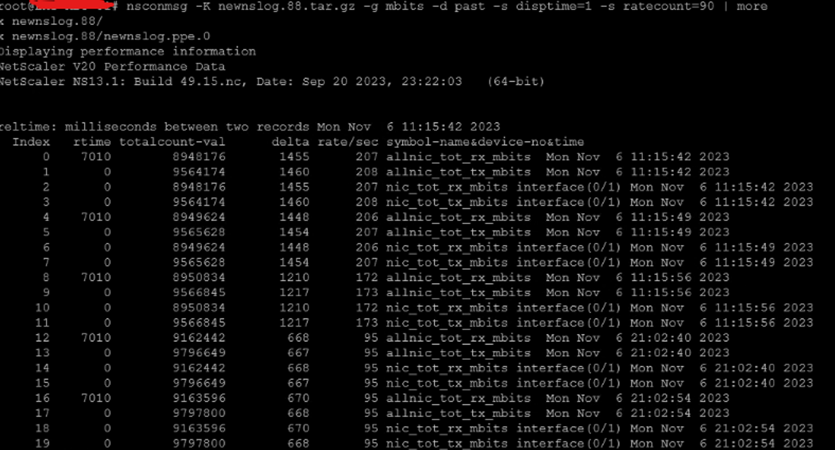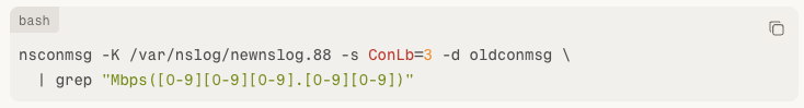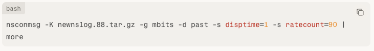 -K newnslog.88.tar.gz– read from the selected log archive.-g mbits– display throughput in Mbps.-d past– analyse historical data.-s disptime=1– include timestamps.-s ratecount=90– only show entries above 90 Mbps.