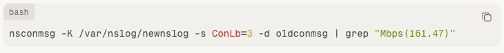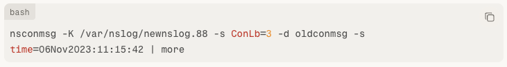-s ConLb=3– show load‑balancing virtual server statistics.-d oldconmsg– dump historical connection messages.-s time=...– filter on the exact timestamp of the spike.