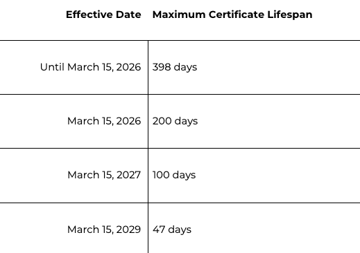 The CA/Browser Forum, a consortium including Google, Apple, and Microsoft, has mandated phased reductions for TLS certificates: